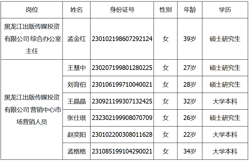 按照《黑龙江出版集团人员招录管理办法》的规定,根据《黑龙江出版传媒投资有限公司公开招聘工作人员公告》明确的条件、流程,经笔试、面试、考察等程序,现将拟录用人员予以公示。