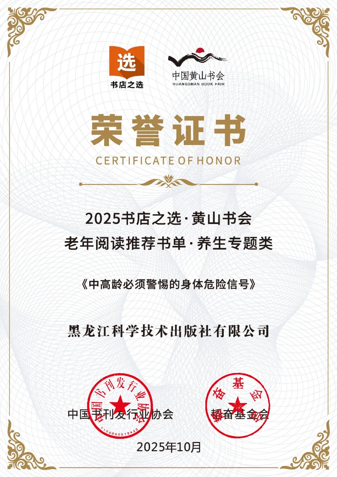 2025年11月15日,由中国书刊发行业协会、韬奋基金会、安徽新华传媒股份有限公司联合主办,北京开卷信息技术有限公司协办,安徽省出版协会发行工作委员会等承办的首届老年阅读创新发展大会,于中国黄山书会期间举行。黑龙江科学技术出版社有限公司出版的《中高龄必须警惕的身体危险信号》一书,凭借其对中高龄人群健康关怀的专业价值,成功入选“2025 书店之选・黄山书会老年阅读推荐书单・养生专题类”。